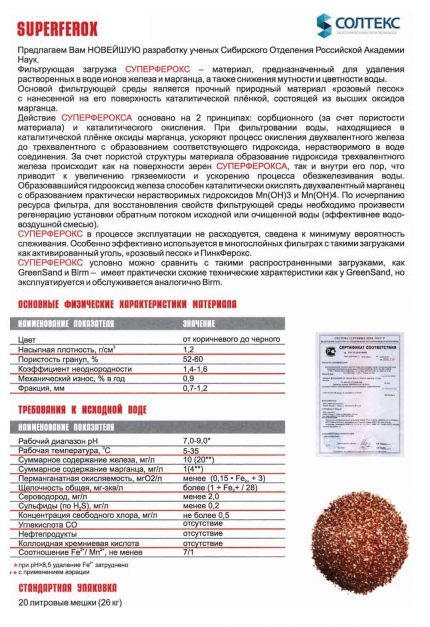 МЖФ — фильтрующий материал на основе природного доломита. В результате модификации получен гранулированный, пористый материал с развитой удельной поверхностью, содержащий в порах высокодисперсный каталитически активный диоксид марганца, являющийся катализатором окисления растворенного в воде железа и марганца. Служит для удаления железа и марганца суммарной концентрацией до 50 мг/л. За счет растворения доломитовой основы спопсобен повышать значение pH и удалять агрессивную углекислоту. Воостановление фильтрующей способности производится обратной промывкой исходной водой. Насыпной вес — 1,4 кг/л; рекомендуемая скорость взрыхления — 24-29 м/ч. Требования к обрабатываемой воде: pH — 5,5-9,0.