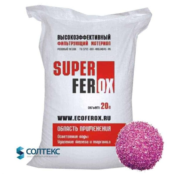 Фильтрующая загрузка Суперферокс — материал, предназначенный для удаления растворенных в воде ионов железа и марганца, а также снижения мутности и цветности воды. Основой фильтрующей среды является прочный природный материал «розовый песок» с нанесенной на его поверхность каталитической пленкой, состоящей из высших оксидов марганца.